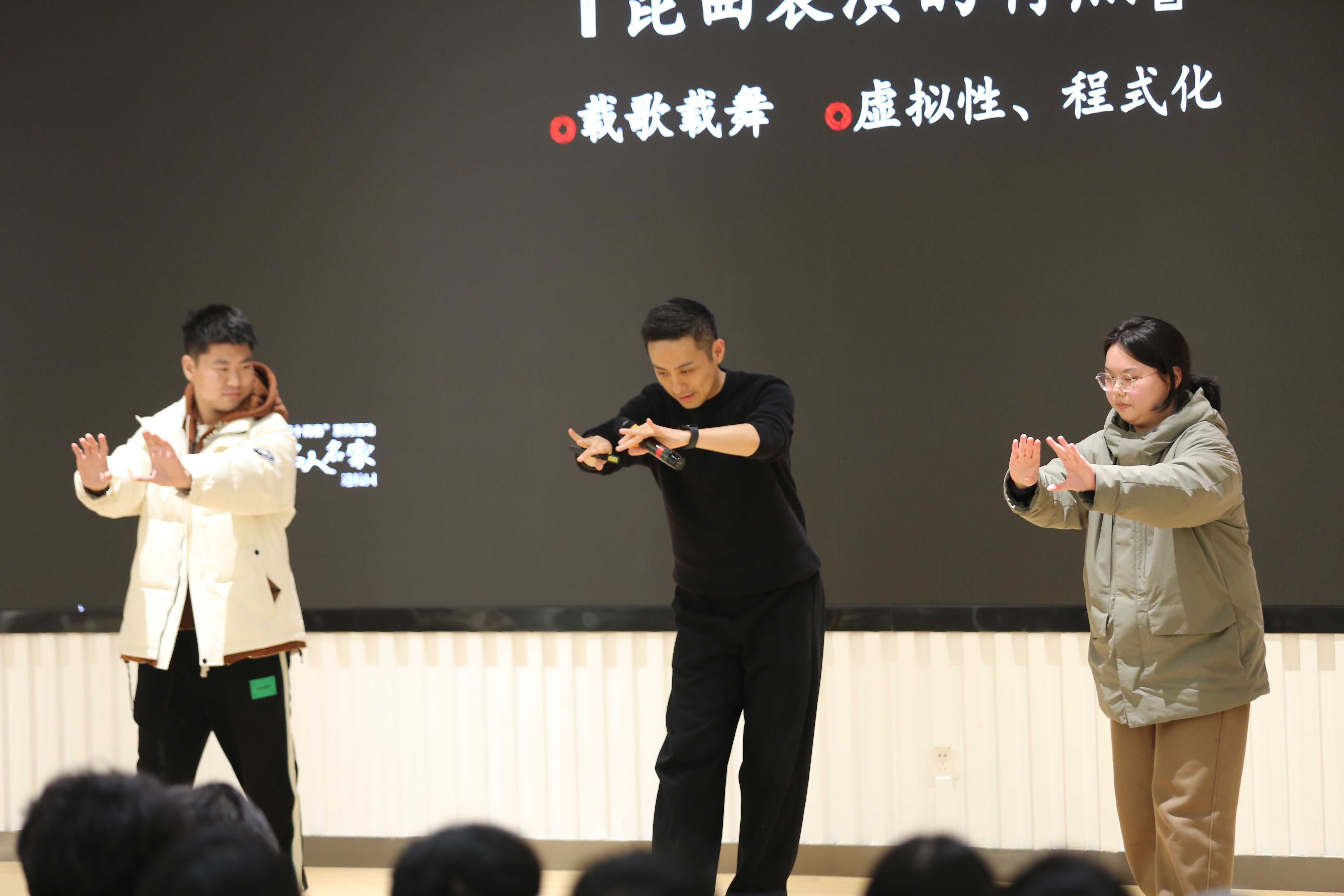 施夏明老师从昆曲小生的“四功五法”技法体系入手,深入浅出地讲解了南北音韵的声腔特质及行当艺术的多维表达等多个层面的昆剧知识。他通过折扇开合等动作演示,生动诠释了小生表演艺术的精髓,将昆曲艺术的细腻与优雅展现得淋漓尽致。讲座过程中,施老师还邀请学生上台模仿昆剧身段,将理论解析转化为沉浸式教学,让同学们在抬步落掌间切身体会昆曲艺术的独特韵味。